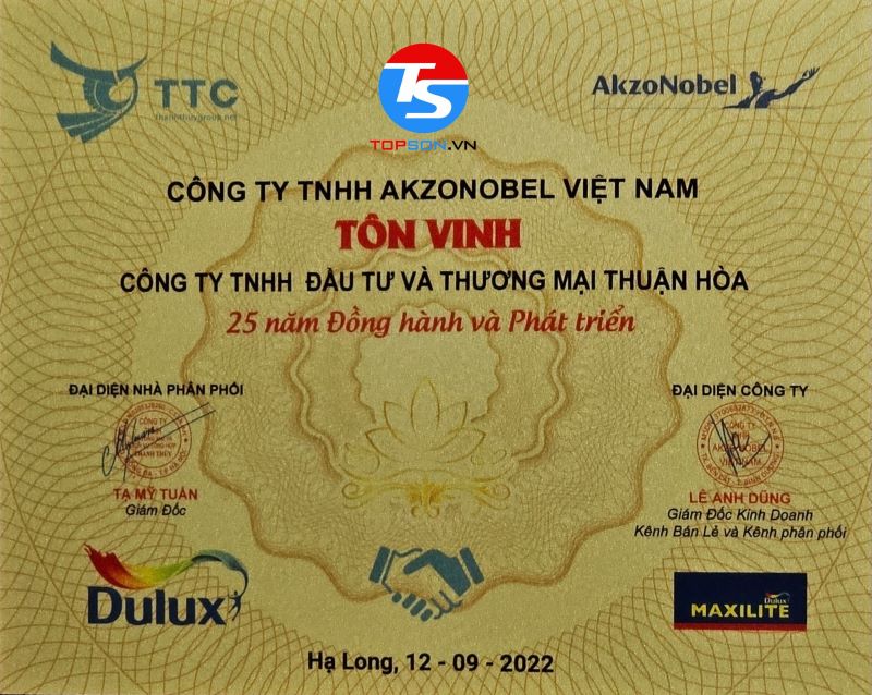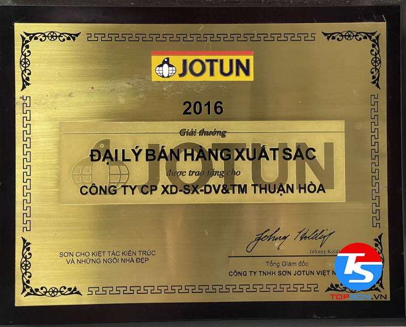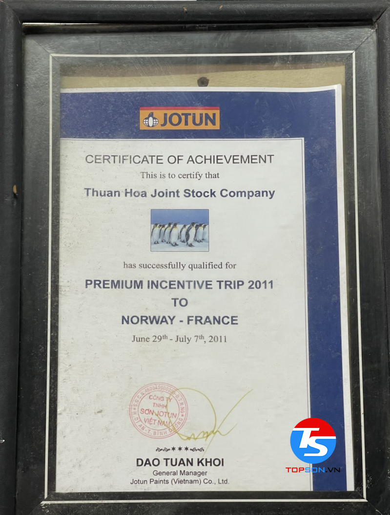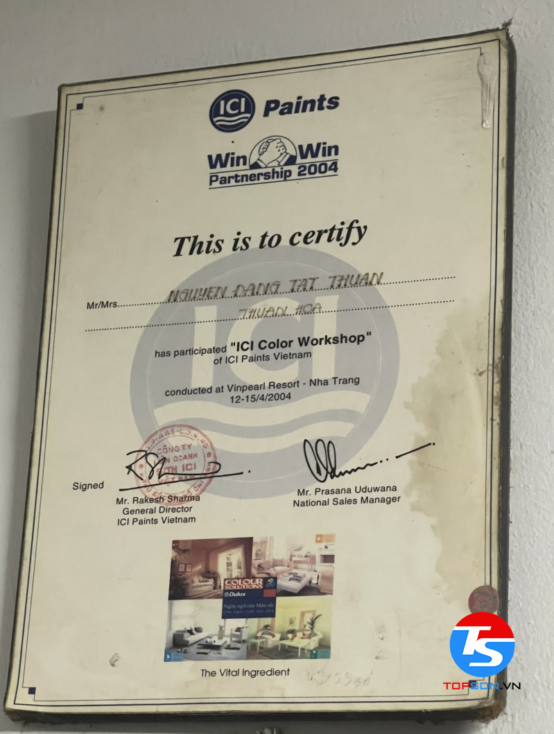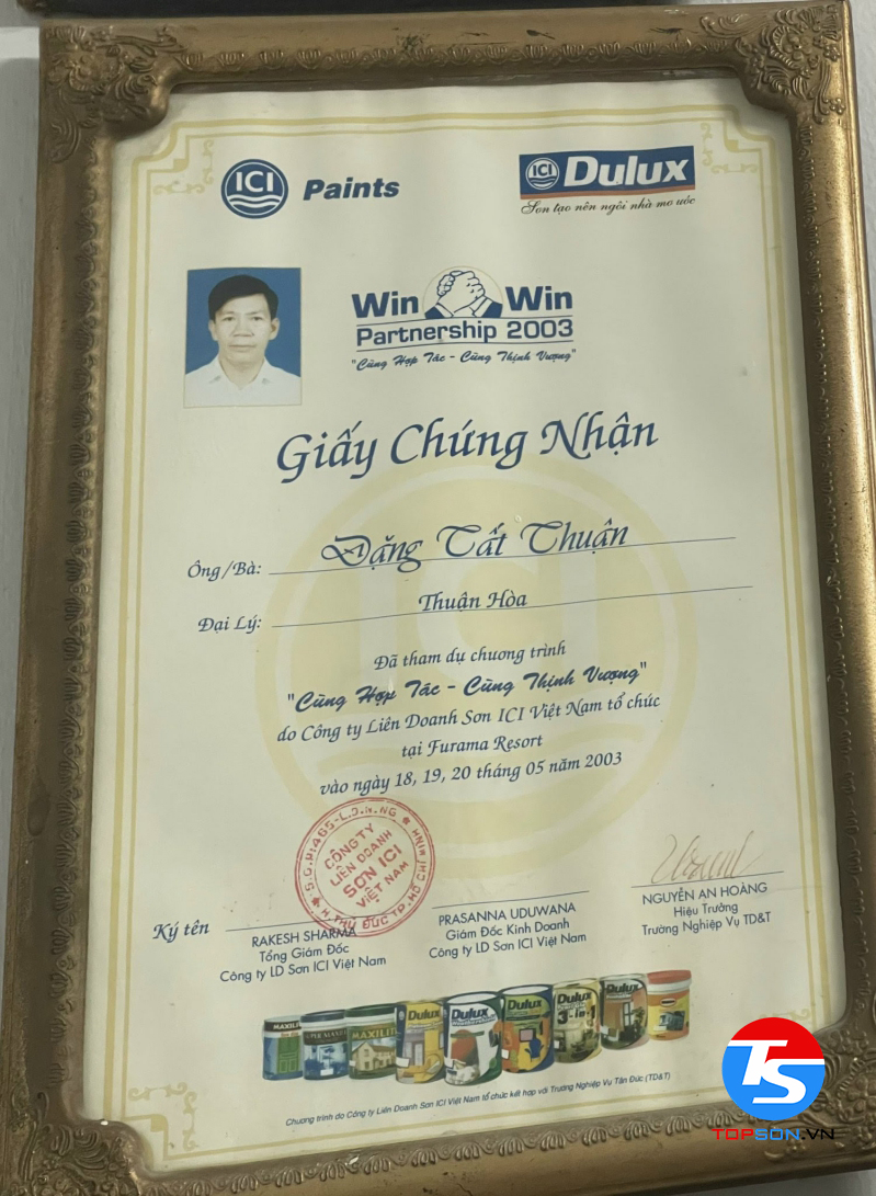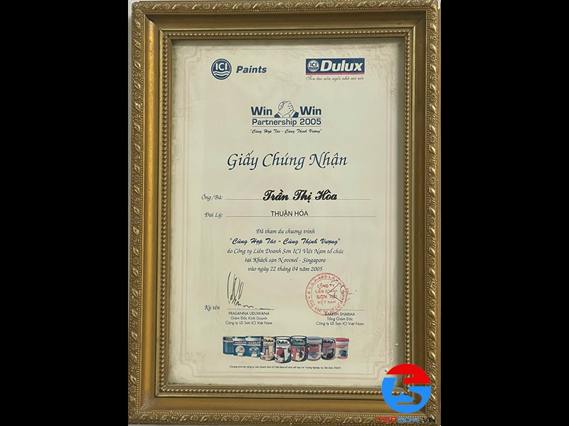 Trong những giấy chứng nhận mà TOPSON đã gặt hái được trong thời gian qua, chứng nhận khiến chúng tôi tự hào nhất phải kể đến là đại lý phân phối sơn nội ngoại thất cao cấp số 1 tại Việt Nam. Đây không chỉ là sự minh chứng cho thành công và cố gắng của TOPSON mà chính là sự đánh giá của khách hàng với sản phẩm của chúng tôi.