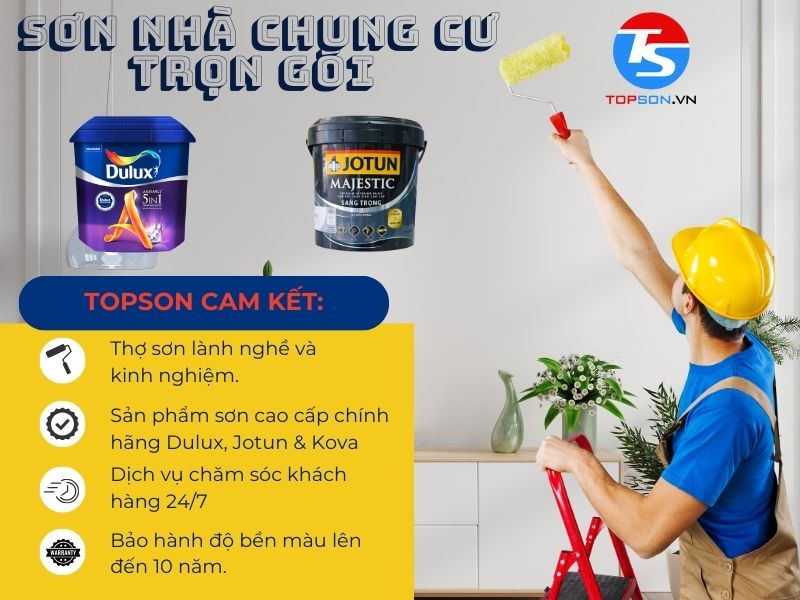 Nếu bạn muốn sơn nhà chung cư một cách nhanh chóng, đẹp mắt và tiết kiệm chi phí, Topson Việt Nam là lựa chọn hàng đầu của bạn. Chúng tôi cam kết mang đến cho bạn không gian sống hoàn hảo với mức giá phải chăng.