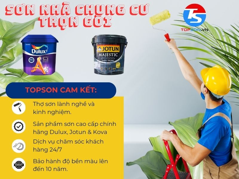 Nếu bạn muốn sơn nhà chung cư một cách nhanh chóng, đẹp mắt và tiết kiệm chi phí, Topson Việt Nam là lựa chọn hàng đầu của bạn. Chúng tôi cam kết mang đến cho bạn không gian sống hoàn hảo với mức giá phải chăng.